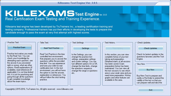 We provide actual questions and answers that we obtain from killexams.com. This question bank contains up to date exam dumps that help to pass exam at first attempt. Killexams.com develop Exam Simulator for realistic exam experience. Exam simulator helps to memorize and practice questions and answers. We take premium exams from Killexams.com